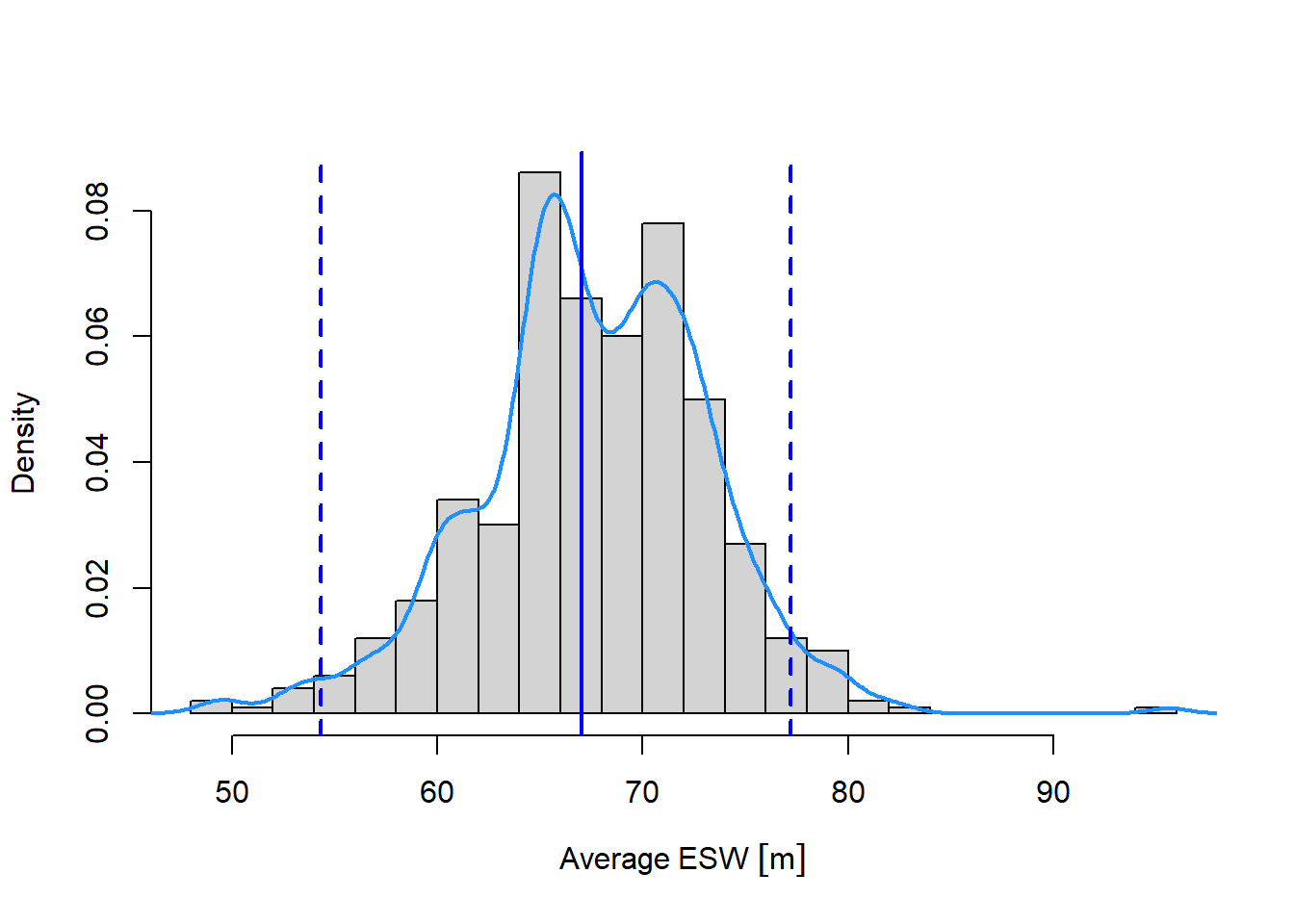 Figure 2: Bootstrap distribution of average ESW for Brewer’s sparrow (grey bars, light blue line) showing the point estimate of average ESW (vertical blue line) and 95% confidence interval endpoints (vertical dashed lines).