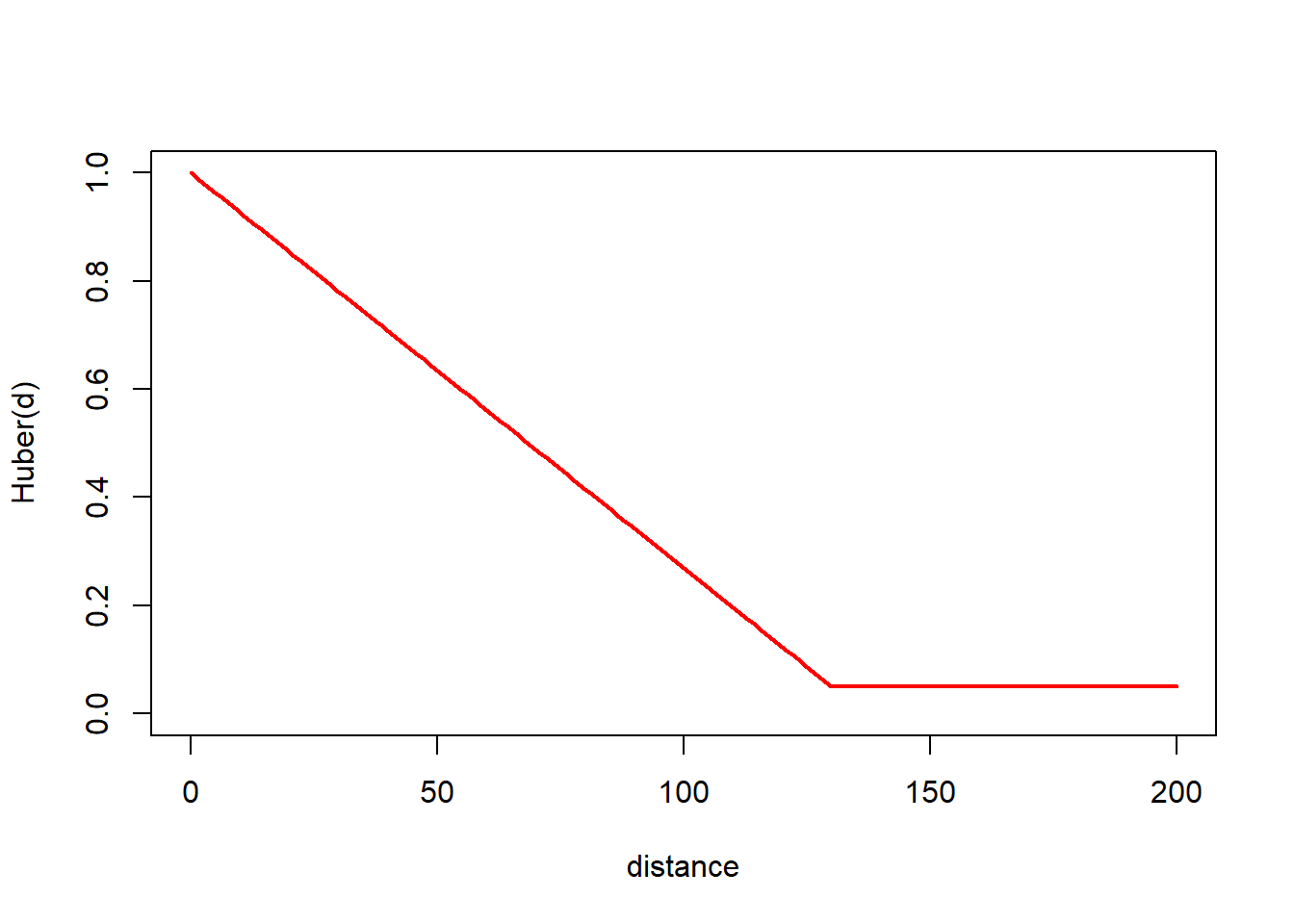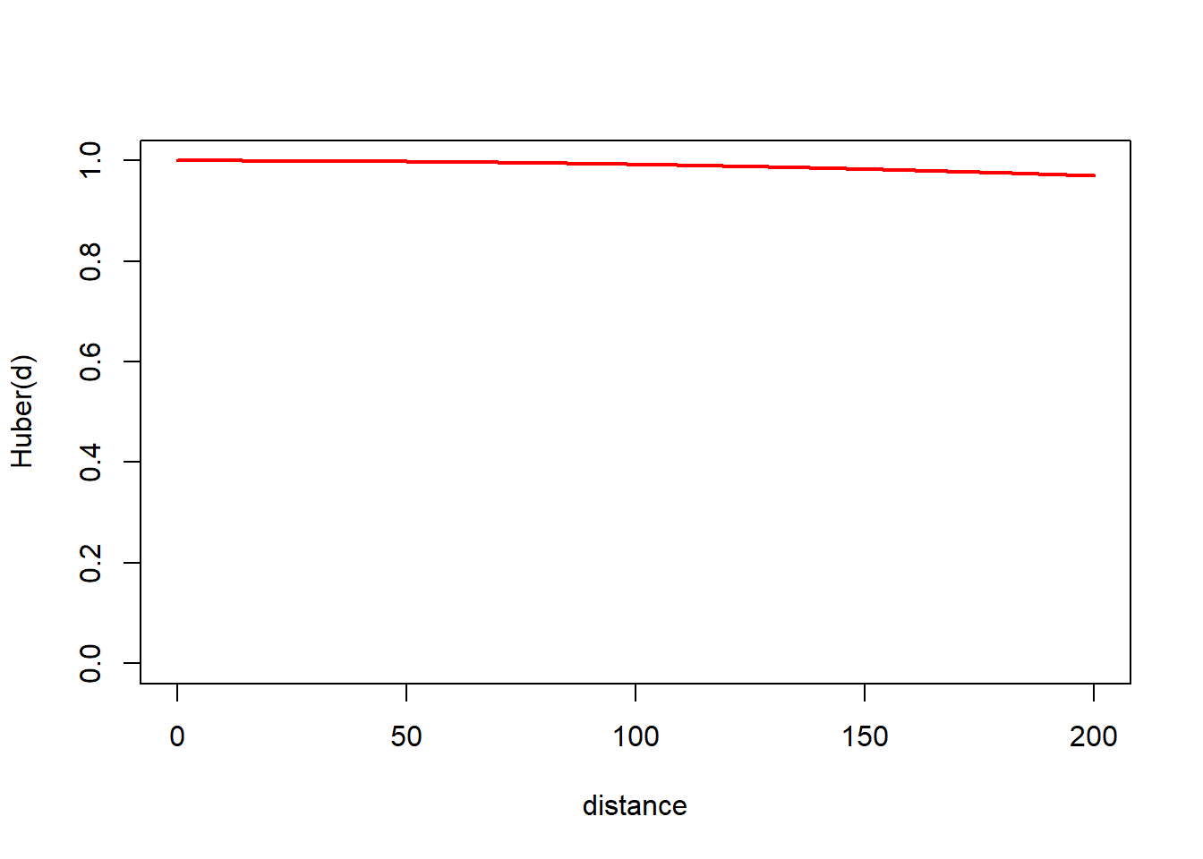 Rdistance’s huber likelihood is an inverted version of the Huber loss function (Huber loss)1, mixed with a uniform at the upper end. We added two parameters to the classic Huber loss function to make it appropriate to use as a distance function; hence, Rdistance’s huber likelihood contains three canonical parameters.