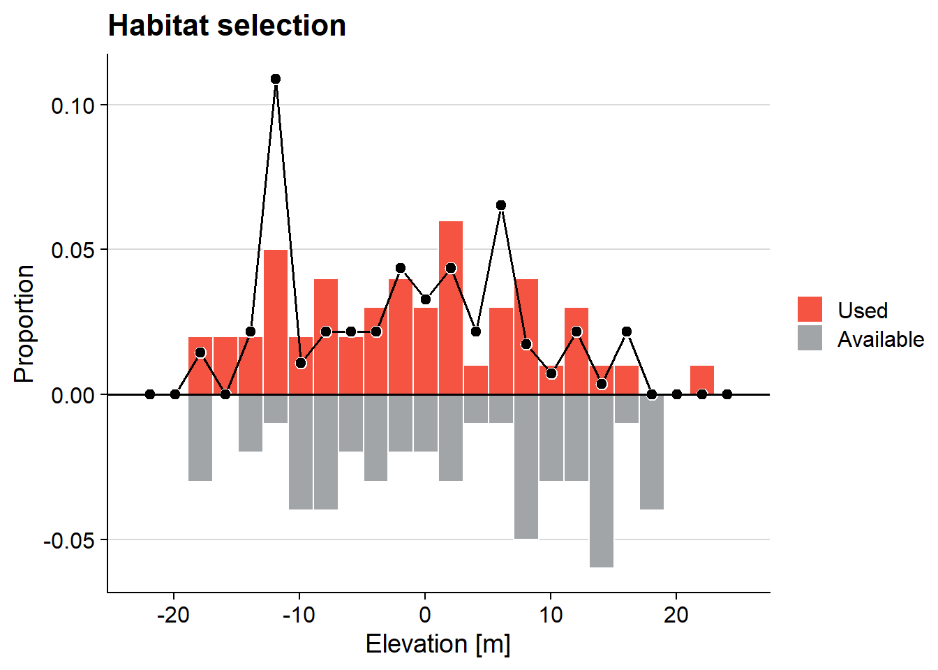 geom_smoothfunction. A smoothed function of the ratios is the one-dimensional resource selection function (RSF) for the resource plotted on the x-axis.